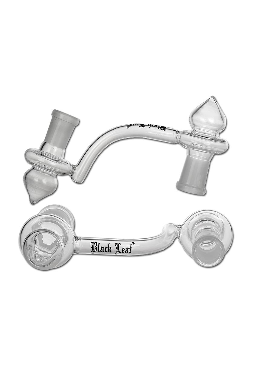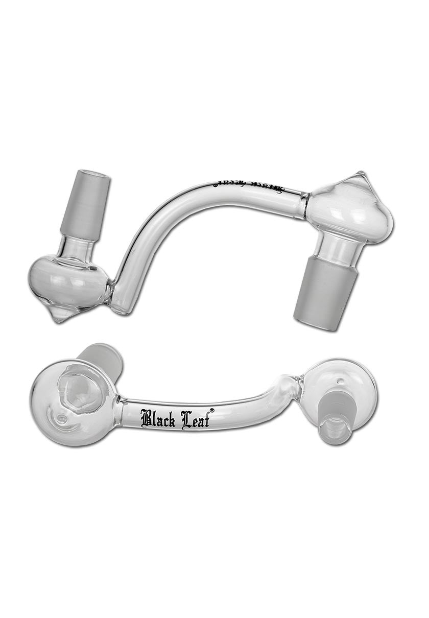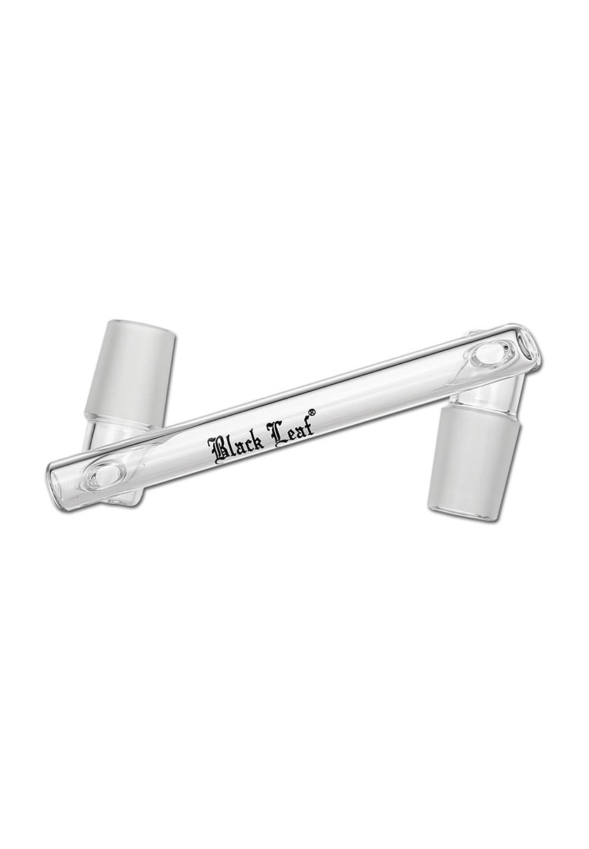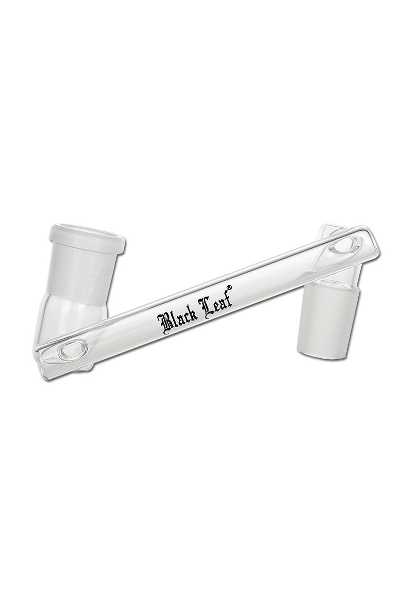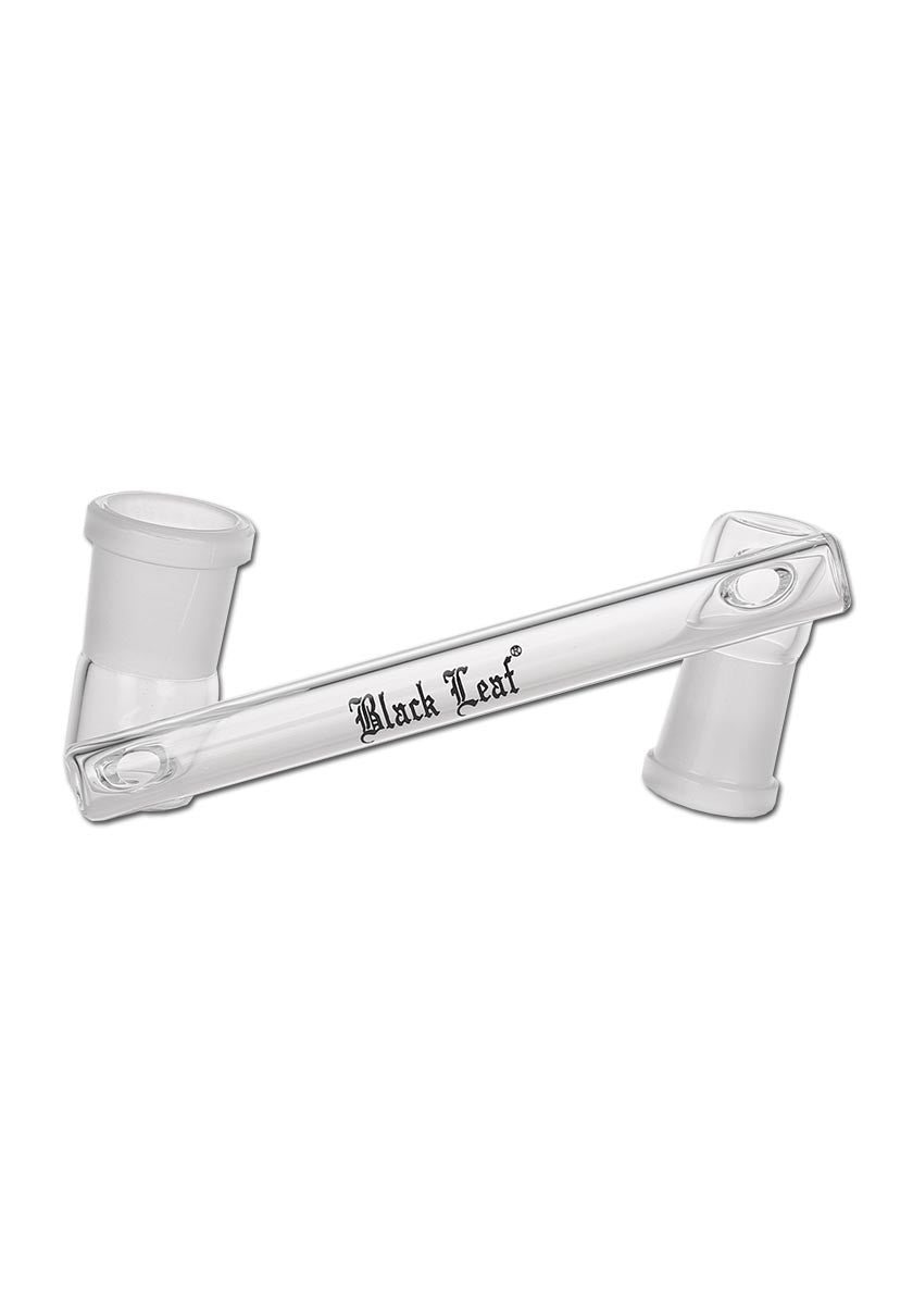 Der Drop Down Adapter von Black Leaf® erweitert den Abstand zum heißen Ölnagel oder Köpfchen. Dies erleichtert die Handhabung mit Brennern oder Dabbing-Werkzeugen und bietet zusätzlichen Schutz für den Nutzer sowie das Glas vor Hitze. Zudem verbessert er die Sichtbarkeit beim Ansetzen des Tupfers. Die Kupplungen ermöglichen es, die Bong von männlichen auf weibliche Normschliffe und umgekehrt umzurüsten. Mit den passenden Kupplungen können alle Banger oder Köpfe mit abweichendem Normschliff mit der Wasserpfeife verbunden werden. Der Adapter besteht aus Borosilikatglas und hat einen 90° Ansatz. Die spezifischen Merkmale umfassen das Material Borosilikatglas, das Black Leaf Logo, die Normschliffe NS 14F/14, eine Länge von 114 mm und einen Ansatzwinkel von 90°.