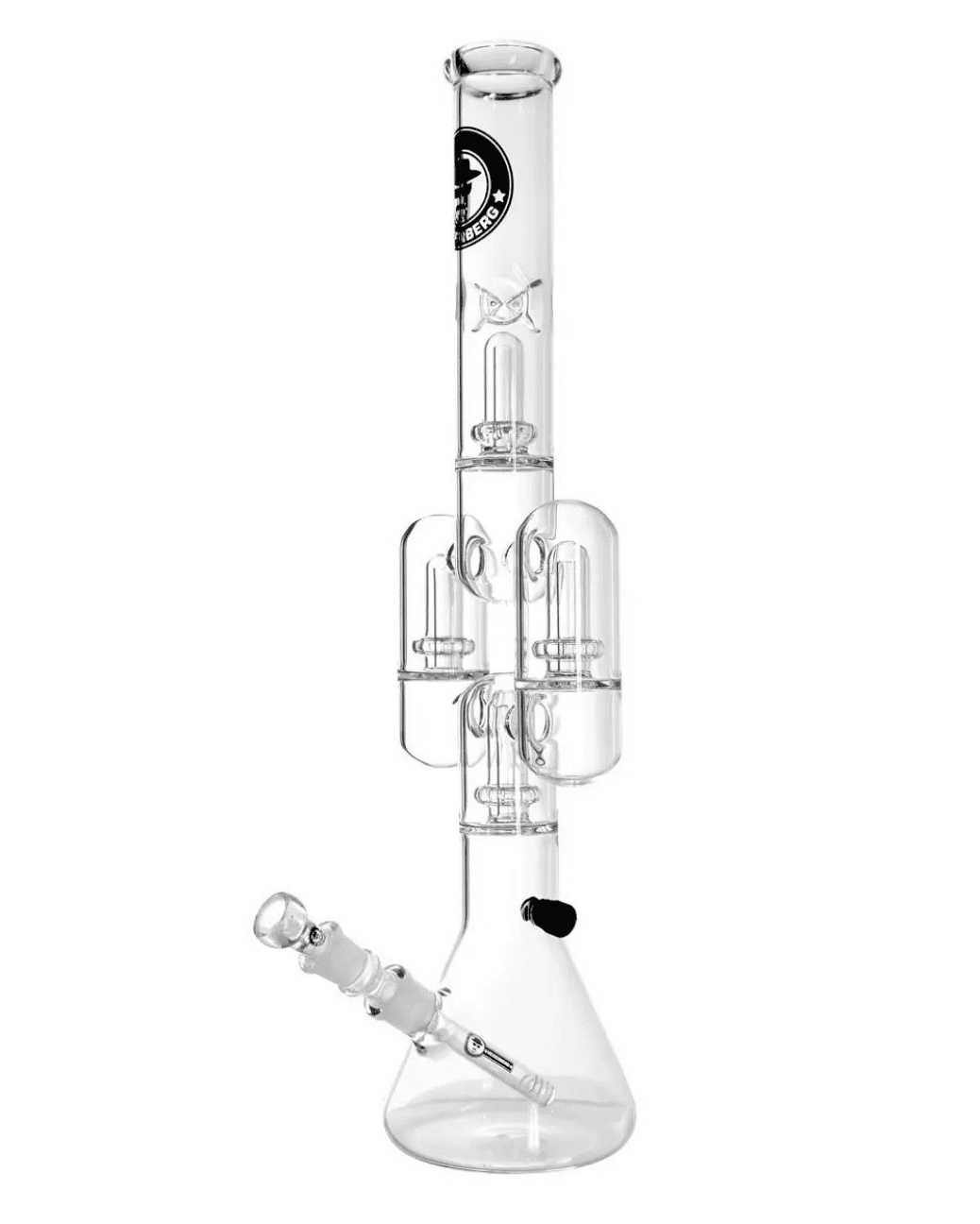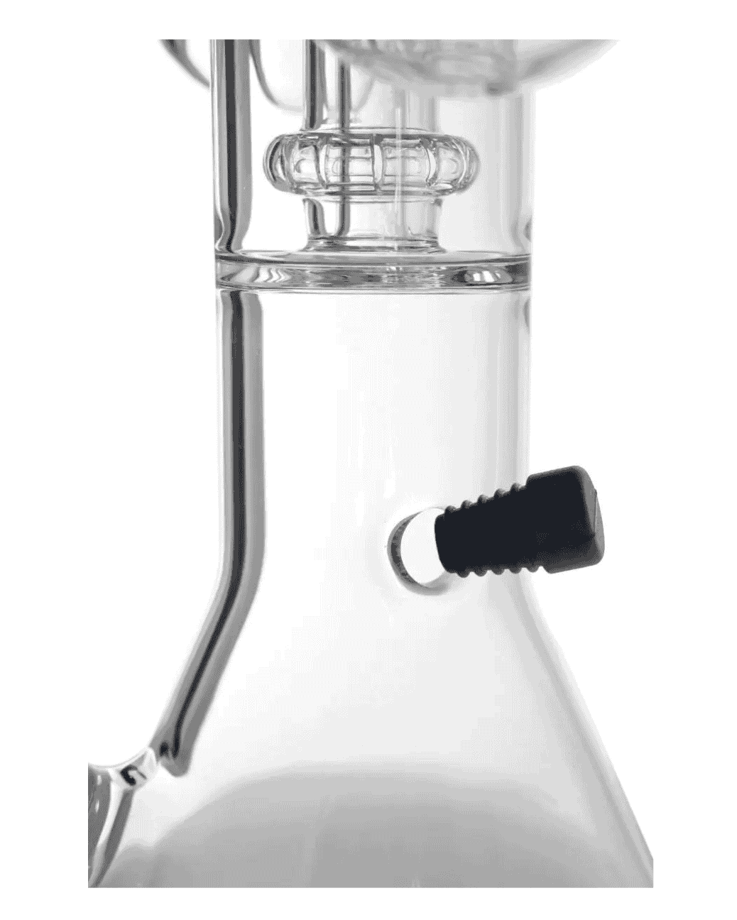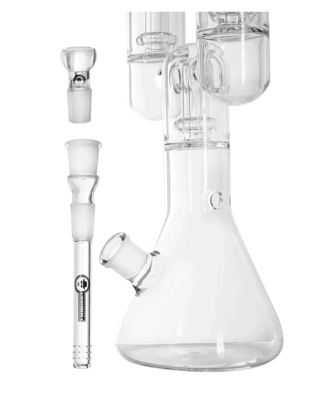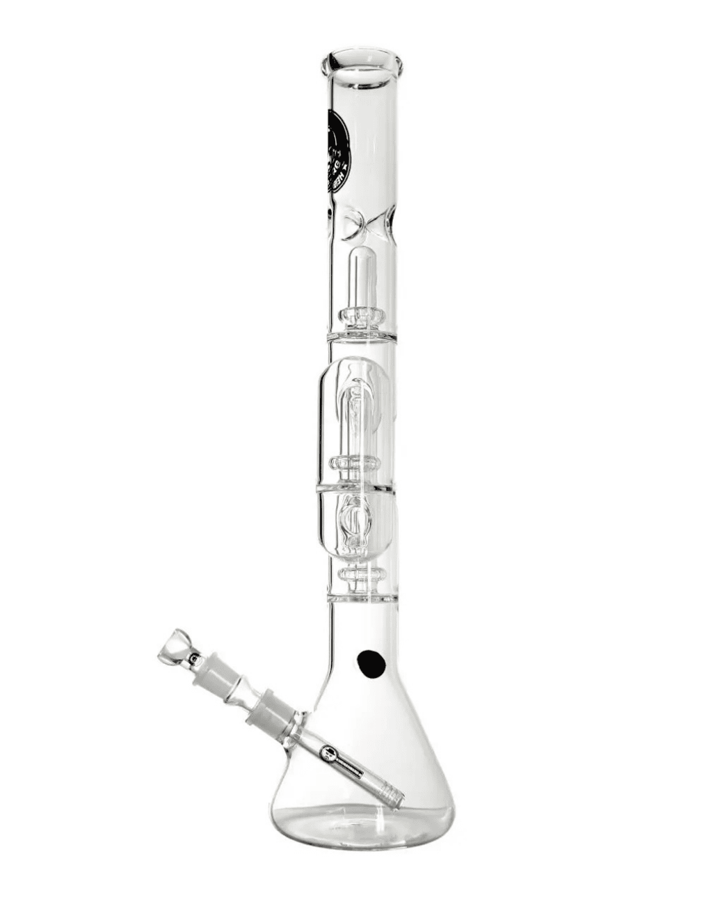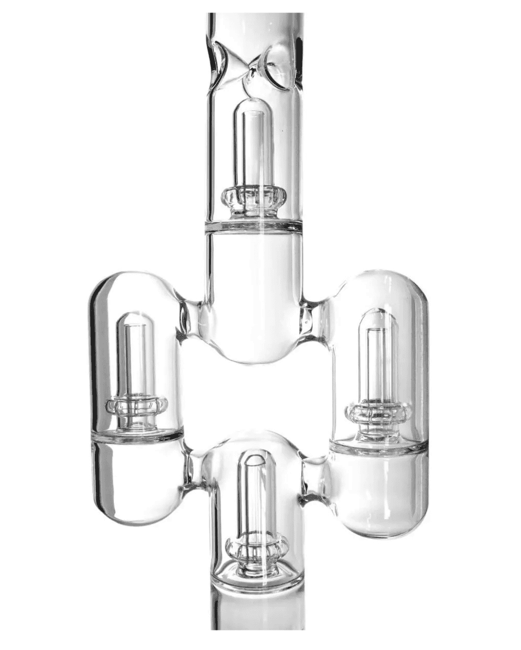 The bong features a total of five swirling zones. The smoke is first directed through the slotted diffuser in the chillum, which extends into the bong's beaker. From there, it enters a percolator chamber with a UFO showerhead perc, where it is further cooled. This process is repeated with three more showerhead percolators.