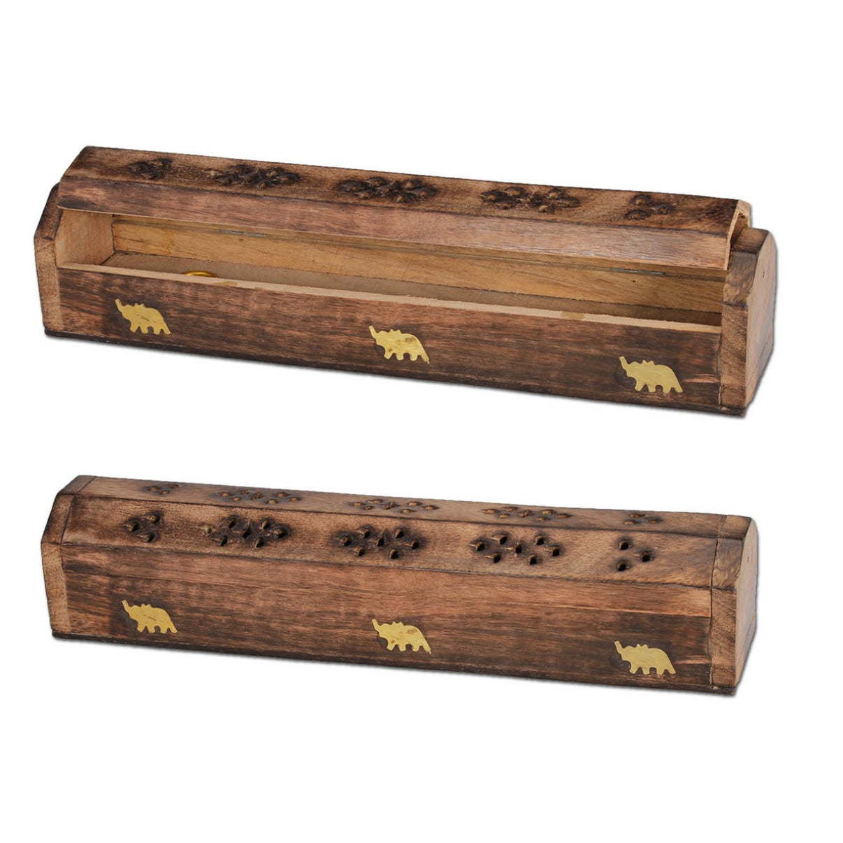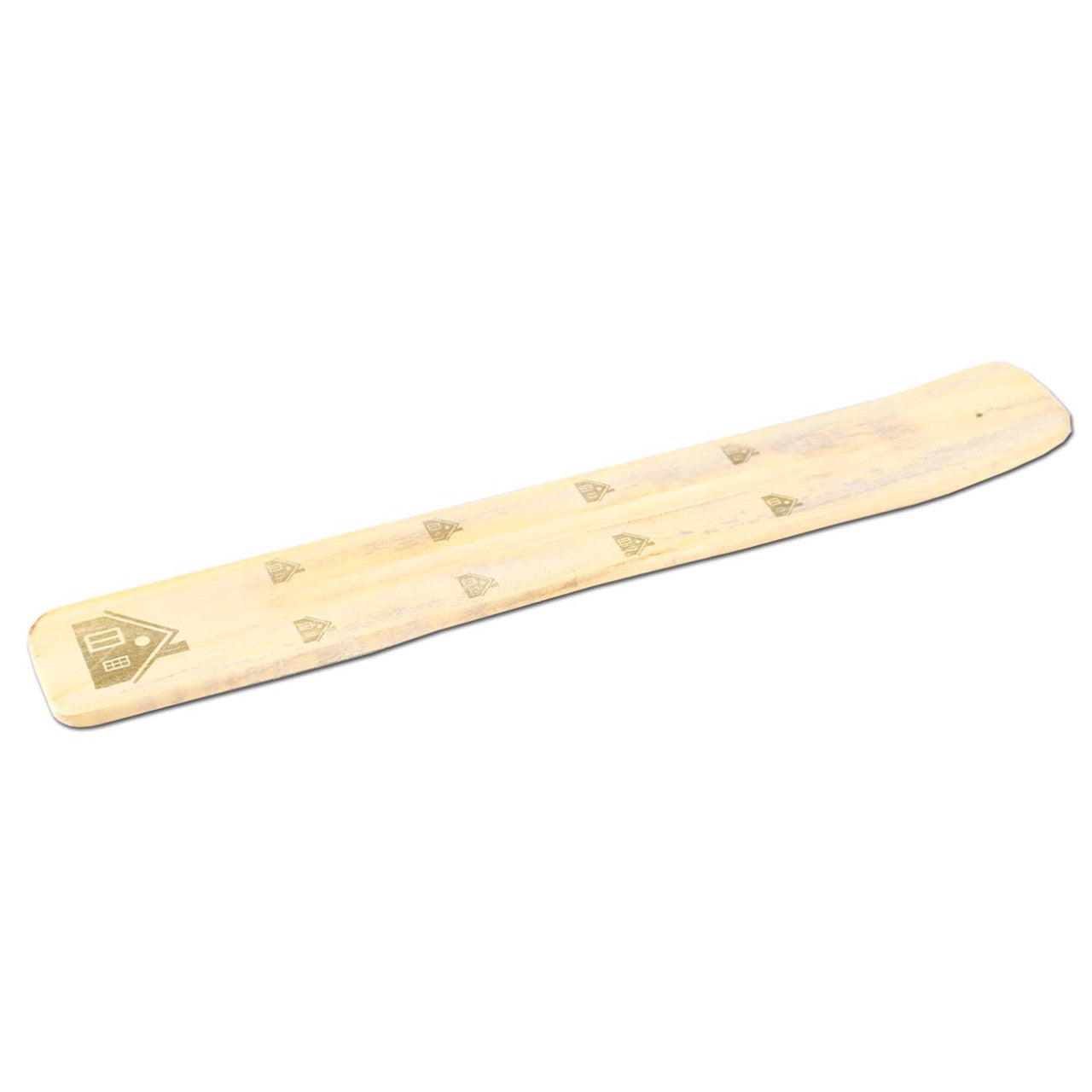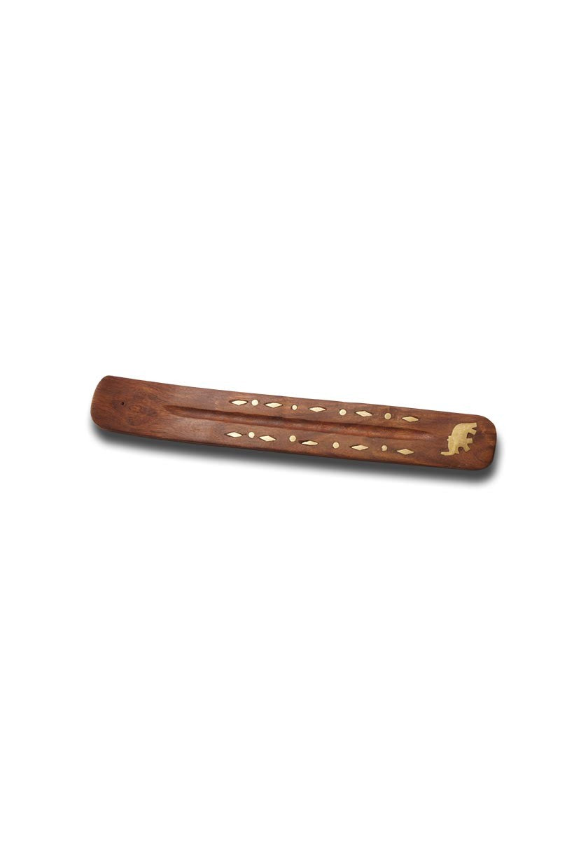 Der Räucherstäbchenhalter besteht aus Holz und ist mit Messingintarsien verziert. Die Gesamtlänge des Halters beträgt 260 Millimeter.