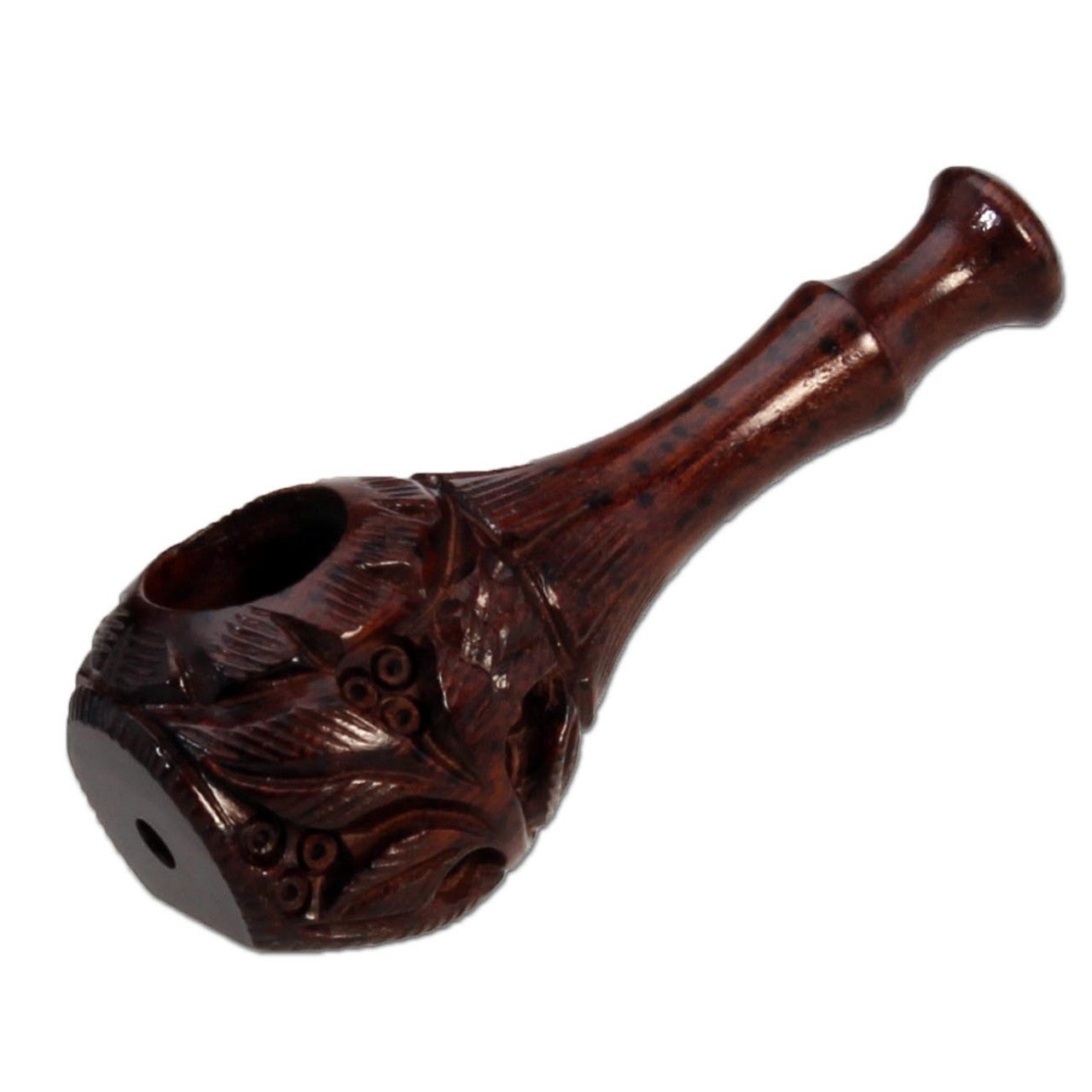 Die Pfeife aus Rosenholz zeichnet sich durch eine filigrane Schnitzerei und eine zierliche Form aus. Sie besteht aus Holz und hat eine Länge von 90 mm.